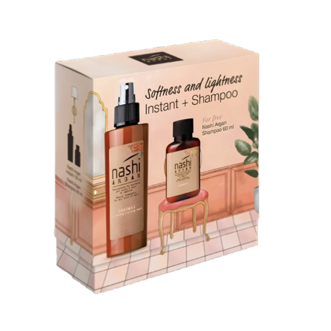 Незрівнянний дует Nashi Argan Інстант, 150 мл. та Nashi Argan Шампунь, 60 мл. в елегантному подарунковому пакуванні. Ваші улюбленці, без яких щоденний ритуал догляду за волоссям неможливий.