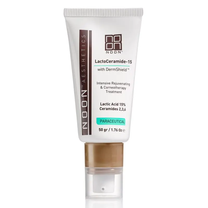 Високоефективний омолоджуючий лікувальний крем LactoCeramide-15 Noon. Містить 15% молочної кислоти при pH 3.2, яка разом з керамідами 2, 3 і 6, а також COSMEDERM-7™ (міжнародний патент) є унікальною формулою, що запобігає типовому подразненню, характерному для препаратів з високою концентрацією молочної кислоти.