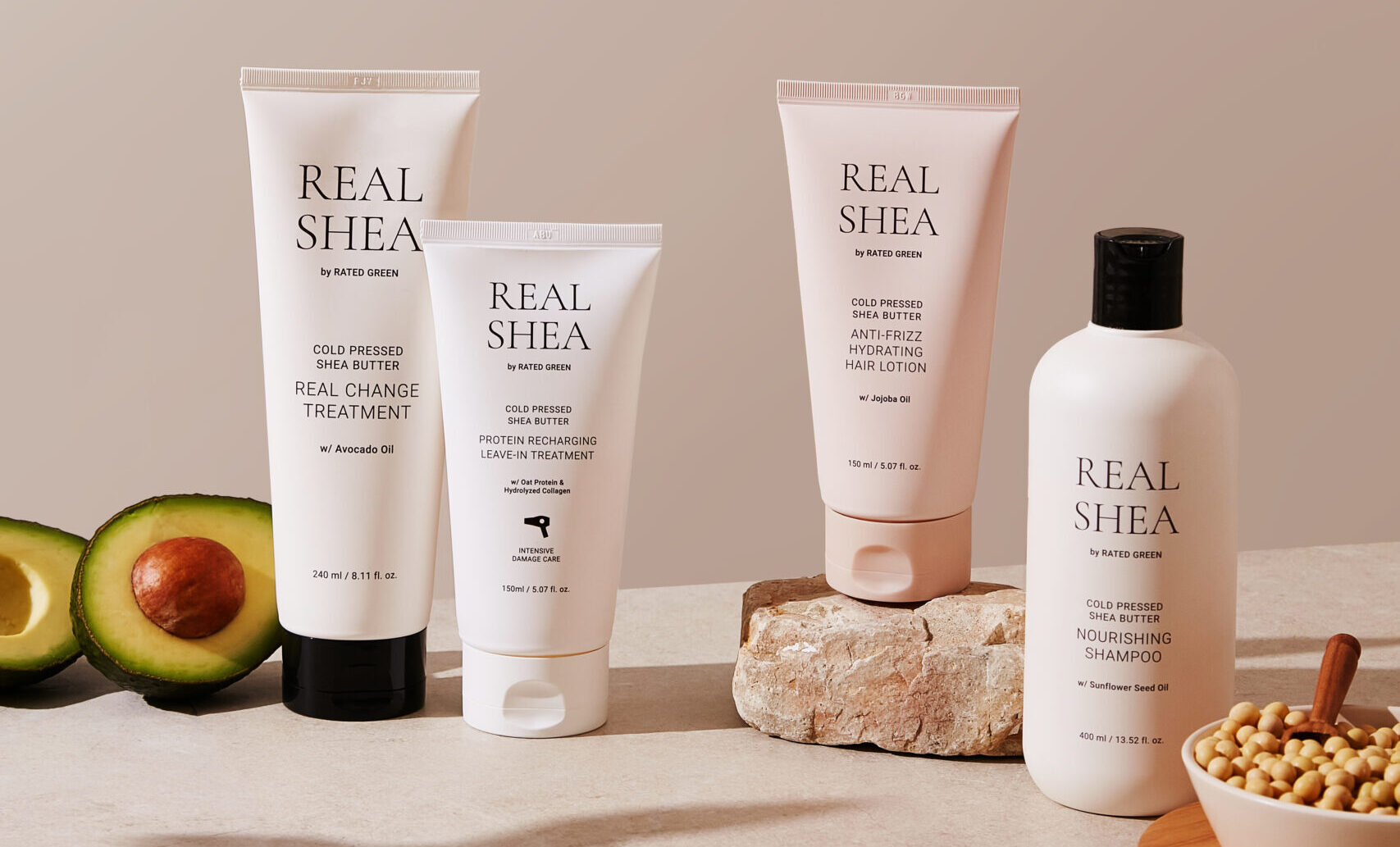 В лінійку RATED GREEN Real Shea входить: живильний шампунь для глибокого очищення та зволоження, який не пересушить волосся, термозахисний відновлюючий крем, живильна маска, яка допомагає відновити волосся зсередини та забезпечує тривалий ефект, зволожуючий лосьйон для боротьби з неслухняними локонами.